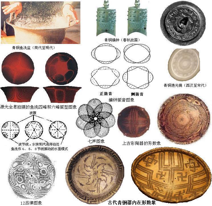 彩陶上的圖象和圖形,展現了上古文明的陳跡,是上文明的結晶,古埃及是幾何圖形見長,中國上古除了簡單幾何圖形,更多是形數象。五千年前,文字的發明,同時青銅器開始出現。中國中古夏代是由陶器向青銅器過渡的時期,殷商能鑄造精美的金器和青銅器。金屬所制的器物比粘土燒制的陶器更具活力,振動聲播、熱導電傳,比陶器優越得多,好比近代的機械的熱動性、近現代電氣的電動性,現代電子的信息性,技術不斷更新。中古的青銅器治金和鑄造技術,沒有現代技術先進,但青銅器一此特殊功能,卻令現代人嘆為觀止,難以模仿。青銅器關鍵是內在的器構,不是外部形體結構。商代為青銅器發展的頂盛時期,其鑄造技術一直延續至明代的近代機械鐵器鑄造興起才失傳。要問中國古代科技成就,眾人熟知的活字印刷、造紙、火藥、指南針的四大發明,這些都是小科技。中國古代高端科技是供人玩樂的中華青銅三大寶,魚洗盆、編鐘、透光鏡,其深藏科學的大道理。如圖〖古代青銅器內在形數象〗所示,經激光全息拍攝,青銅器內在振動圖象,正是上古彩陶上的形數象,摩擦叩擊,洪鐘音樂,透光鏡正面采光,背現影像。中華青銅三大寶展示了中國古代科技工藝,采用了高超的系統數理,八卦符只是系統工具,形數象才是系統數理核心。