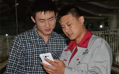 兩名養殖戶正在手機上操作新希望集團推出應用軟件(受訪者供圖)
