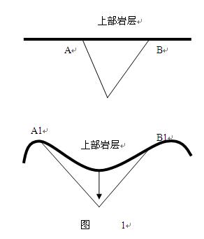 冰輒理論認為:地殼運動與巖漿無關,它是地殼自身結構關系的進一步調整,是地殼自身重力作用的結果。至于山脈的形成,我認為同樣與地下斷裂密切相關,地下斷裂是地質活動的結果,地下斷裂的的擴大與發展更是地質活動的基本運動形式。隨著地下斷裂的擴大與發展,底層斷裂區域承壓能力逐漸降低,上部巖層也因地下斷裂的擴大,最終發生自身重力作用下的區域性沉降。如圖1所示AB、A1B1為斷裂上部的巖層,初始階段斷裂較小上部巖層AB無彎曲,隨著時間的推移斷裂逐漸增大斷裂上部巖層在重力作用下逐漸發生彎曲(如A1B1所示),這時,區域性沉降的上部巖層的兩端A1、B1處相對隆起,產生褶皺,這就形成了山脈。