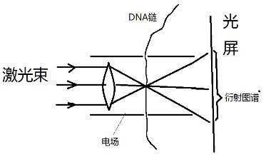 測序流程:合成一段已知序列的單鏈DNA,要求含有全部A G C T四種核苷酸。在脈沖電場作用下,這段已知序列的帶負(fù)電的DNA單鏈被拉直并一堿基一堿基的通過納米孔,每通過一個(gè)堿基便會出現(xiàn)數(shù)微秒的停頓。低能超細(xì)高頻激光束經(jīng)過聚焦,在焦點(diǎn)處與剛剛經(jīng)過納米孔的DNA單鏈相遇,經(jīng)過衍射,在另一側(cè)的光屏上形成衍射圖譜,由于DNA單鏈的間續(xù)性運(yùn)動,會產(chǎn)生間續(xù)性衍射圖譜,以衍射圖譜與DNA序列作對比,可以得出每種圖譜對應(yīng)的堿基。