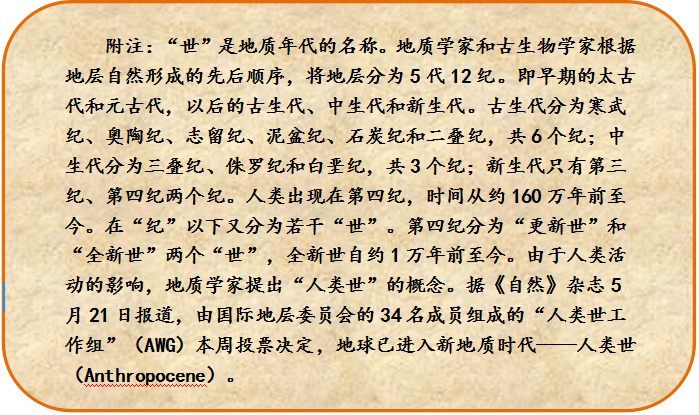 在2000年的一個國際會議上,1995年諾貝爾化學獎得主保羅-克魯岑提出,當今人類活動對自然環境的影響已經超過了自然狀態的變化,應該定義一個新的地質時代,叫人類世。我國科學家劉東生院士參加了此會,回國后就極力推薦這個詞。
