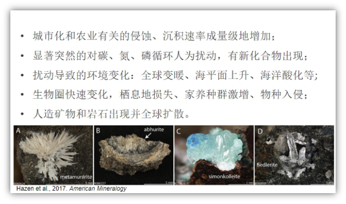 國際地層委員會的人類世工作組工作了10年,總結了一些現象,如城市化和農業的侵蝕、沉積速率成量級地增加,顯著而突然的對碳、氮、磷循環的人為擾動,產生一些新的化合物,使得生物圈出現快速變化、棲息地的損失帶來植物多樣性的降低、馴化生物種群大規模增加,人類的遷徙活動等等。
