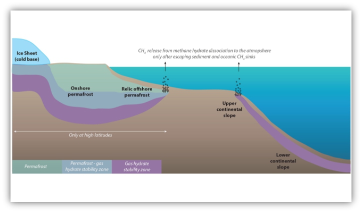 全球變暖,海洋中,深度在2000米以內的海水升溫,將導致在陸坡上存在的可燃冰(固態甲烷水合物)釋放,空氣中的甲烷會迅速氧化成二氧化碳,使二氧化碳濃度急劇增加。