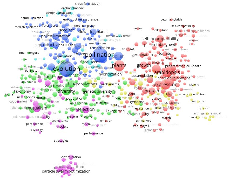 利用Vos Viewer軟件分析2013-2017年中國傳粉生物學領域的SCI論文,獲得中國傳粉生物學領域的研究熱點是:1)植物花粉管生長、發育等分子、細胞層面基礎機制研究;2)傳粉昆蟲的分類學研究,及其遺傳多樣性、保護、種群擴散等方面的研究;3)昆蟲傳粉在植物遺傳育種、進化中發揮重要作用;4)與傳粉相關的植物轉錄因子、microRNA、殺蟲劑耐藥性等方面的研究;5)傳粉昆蟲的種群優化、傳粉昆蟲互作等方面的研究。