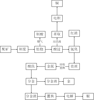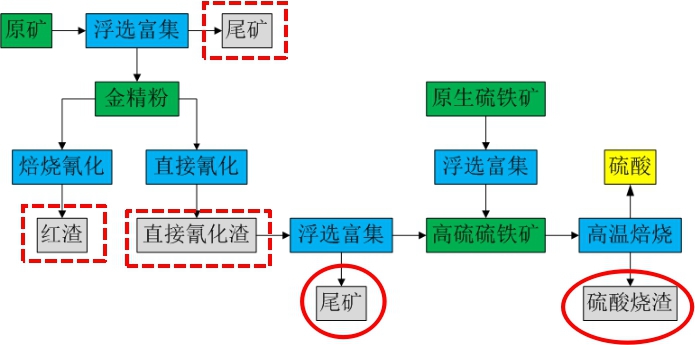 黃金生產(chǎn)過程的固廢包括浮選尾礦、氰化渣(紅渣和直接氰化渣)(圖3)??蓪鹁V的浮選尾礦進行氰化提金或制造建材,對直接氰化渣進行浮選回收有價元素。