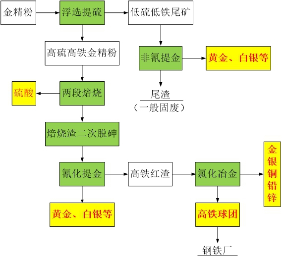 我們提出了黃金未來發(fā)展的一個思路。黃金綠色選冶技術(shù)包括以下三個部分:難選冶金精粉硫鐵富集選、兩段焙燒?氰化提金(含焙燒渣二次脫砷)、高鐵紅渣高值化綜合利用、尾礦非氰提金。終端產(chǎn)品包括金、銀等貴金屬、硫酸、銅、高品質(zhì)煉鋼粒鐵(球團)等。該流程產(chǎn)業(yè)鏈結(jié)構(gòu)完整,實現(xiàn)真正意義上的資源循環(huán)利用;綜合回收礦物中的金、銀、銅、鉛、鋅等有色金屬和鐵,各有價元素的資源化利用得到最大化,避免了資源浪費;實現(xiàn)了氰化尾渣的無害化利用,整個過程沒有危險固廢產(chǎn)生,廢氣達標排放,水循環(huán)使用無外排;能夠處理多元素含砷復(fù)雜金精礦,對原料的適用性強(圖4)。