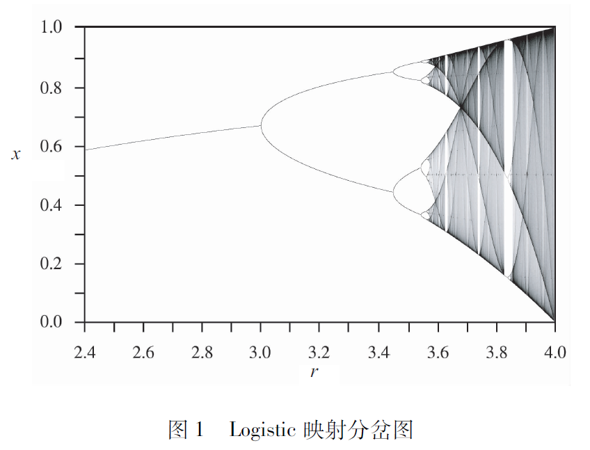 首先給大家介紹一下非線性動(dòng)力學(xué)的基本概念。考慮到在座的大多是等離子體方面的專家,對(duì)非線性動(dòng)力學(xué)不太熟悉,因此我就從最簡(jiǎn)單的離散映射系統(tǒng)開始為大家進(jìn)行介紹。這個(gè)映射系統(tǒng)雖然看起來非常簡(jiǎn)單,但足以讓大家比較好地理解非線性動(dòng)力學(xué)的基本概念。Logistic映射數(shù)學(xué)表達(dá)式是xn+1=rxn(1-xn),它是非線性動(dòng)力學(xué)里非常基礎(chǔ)的一個(gè)例子。盡管Logistic映射看起來很簡(jiǎn)單,但它已經(jīng)是一個(gè)動(dòng)力學(xué)系統(tǒng),即它的狀態(tài)變量是隨時(shí)間演化的。對(duì)于我們現(xiàn)在討論的Logistic映射,比如說第n步是xn,那第n+1步是什么呢?很簡(jiǎn)單,由映射關(guān)系就可以得到xn+1。我們來觀察它隨時(shí)間會(huì)如何演化,比如說從x0開始,迭代第一步得到x1,再得到x2,一直迭代下去我們最終可以觀察到映射的穩(wěn)態(tài)結(jié)果,那我們究竟可以觀察到什么樣的穩(wěn)態(tài)行為呢?這其實(shí)就是非線性動(dòng)力學(xué)研究的一個(gè)主要內(nèi)容。我們來看這么一個(gè)簡(jiǎn)單的Logistic映射,圖1給出了它的分岔圖。顯然,映射最終的穩(wěn)態(tài)行為是與映射的參數(shù)有關(guān)系的,通過圖1的分岔圖我們就可以觀察映射在各個(gè)參數(shù)下的穩(wěn)態(tài)行為。