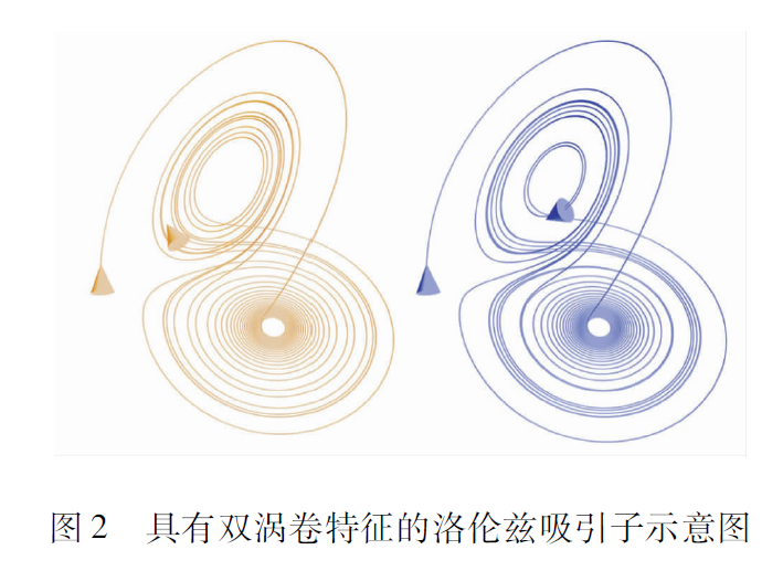 洛倫茲系統(tǒng)其實(shí)就是一個(gè)簡(jiǎn)單的三維自治ODE方程組,洛倫茲發(fā)現(xiàn)在某些參數(shù)下該系統(tǒng)會(huì)出現(xiàn)混沌行為。圖2給出了洛倫茲系統(tǒng)具有雙渦卷特征的混沌吸引子相圖,注意其軌道是永不重復(fù)的。