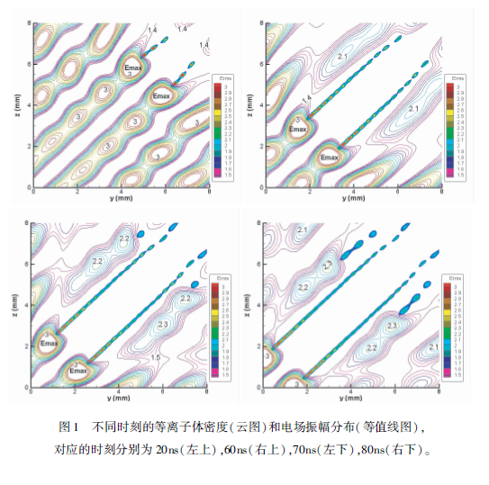 下面看一下相交微波束大氣擊穿的模擬結(jié)果,我們首先算了同頻率微波相交的情況,此時(shí)相干疊加之后,由于干涉作用,會(huì)形成電場(chǎng)強(qiáng)度強(qiáng)弱分布。我們首先模擬一下種子電子在弱場(chǎng)區(qū)的情況。因?yàn)樵诖髿庵蟹N子電子是偶然出現(xiàn)的,有可能出現(xiàn)弱場(chǎng)區(qū),如果出現(xiàn)在弱場(chǎng)區(qū),它需要擴(kuò)散,擴(kuò)散到強(qiáng)場(chǎng)區(qū)之后電子碰撞分子發(fā)生雪崩電離,形成的等離子體沿著強(qiáng)場(chǎng)區(qū)做趨源運(yùn)動(dòng),運(yùn)動(dòng)方向沿著)=:的這條線。形成的等離子體的區(qū)域是一個(gè)等離子體絲帶,當(dāng)然如果把氣壓降低,會(huì)發(fā)現(xiàn)絲帶就會(huì)過渡為一個(gè)等離子體帶。圖1給了幾個(gè)典型時(shí)刻的等離子體密度分布和場(chǎng)強(qiáng)的分布,在20ns的時(shí)候,由于靠近等離子體區(qū)域最強(qiáng)的場(chǎng)是沿著)=:這條線的,當(dāng)?shù)入x子體絲帶長(zhǎng)度增加到一定程度的時(shí)候,在其左上和右下區(qū)域,相當(dāng)于把兩個(gè)微波場(chǎng)隔開,這兩個(gè)區(qū)域相當(dāng)于只有一個(gè)單微波的作用,在兩邊有新的等離子體絲帶。如果初始電子出現(xiàn)在強(qiáng)場(chǎng)區(qū),電子碰撞分子就會(huì)雪崩電離,形成等離子體。等離子體區(qū)域也是沿著J=:這條線做趨源運(yùn)動(dòng)。下面簡(jiǎn)單比較了同頻和非同頻微波相交的大氣擊穿,同頻相當(dāng)于相干疊加,非同頻相當(dāng)于非相干疊加,模擬時(shí)間都是80ns,初始的種子電子數(shù)都一樣,可以發(fā)現(xiàn)在相干的情況下,即使把種子電子源放到場(chǎng)強(qiáng)最小的地方,產(chǎn)生等離子體的區(qū)域也大于非相干的情況,而且產(chǎn)生的最大電子數(shù)也是大于非相干的情況。總結(jié)主要有三點(diǎn),一個(gè)是區(qū)域隨壓強(qiáng)的變化,還有等離子體做趨源運(yùn)動(dòng),還有相干比非相干的等離子體區(qū)域比較大。