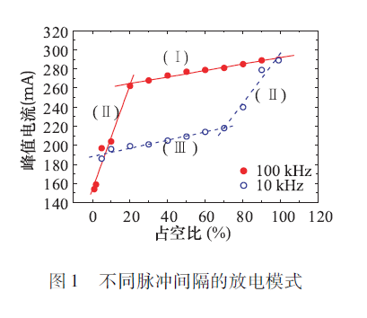 如果兩個(gè)脈沖間隔比較近,那么跟連續(xù)就沒什么差異,因?yàn)槊}沖撤銷以后,即射頻消失以后,電極間還存在的空間電荷,也就是有電子和離子分離存在,這些電子在第二脈沖上來后就會(huì)參與放電,這時(shí)與連續(xù)放電差異性就不大了。如果脈沖間隔范圍足夠?qū)挘@就成為兩個(gè)不同的放電,兩個(gè)放電之間是不相關(guān)的。如圖1( I)是脈沖之間間隔非常小的時(shí)候,稱為連續(xù)模式;下面的Ⅲ是脈沖之間間隔非常大的時(shí)候,稱為分離模式,我們可以看到整個(gè)放電的峰值電流要小不少。在它們之間,(II)稱為傳輸模式,在兩個(gè)脈沖之間,電子沒有完全消亡的情況下放電電流與占空比的關(guān)系。共有上述三個(gè)過程,可見脈沖的間隔長(zhǎng)短對(duì)放電的影響不是由占空比決定,主要是考慮電極之間間距和里面所參與的空間電荷分布變化。
