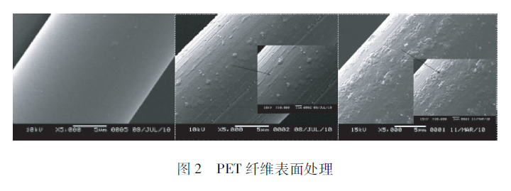 用長(zhǎng)50cm、間距5cm的電極板做了一個(gè)射頻的放電模式。我們用上面介紹的JET做了滅菌實(shí)驗(yàn),細(xì)菌的存活數(shù)量得到了有效的下降。在這里主要看一下對(duì)化纖的處理效果,圖2的左圖是沒有處理過的,中圖是200 W處理的,右圖是800 W處理的。這兩個(gè)之間有什么區(qū)別呢?中圖顯示纖維表面有溝槽出來,這任何化纖在等離子體處理情況下刻蝕的一個(gè)特征,在低真空情況下的射頻放電都會(huì)有溝槽刻蝕出來。但是在大氣壓輝光放電的情況下,表面有許多圓形體產(chǎn)生。我認(rèn)為不單純有刻蝕,而且有表面熔融的狀態(tài)出來。所以說,在大氣壓射頻放電對(duì)表面的作用是相當(dāng)強(qiáng)的。雖然每個(gè)脈沖時(shí)間比較短,但是它的作用非常強(qiáng)。